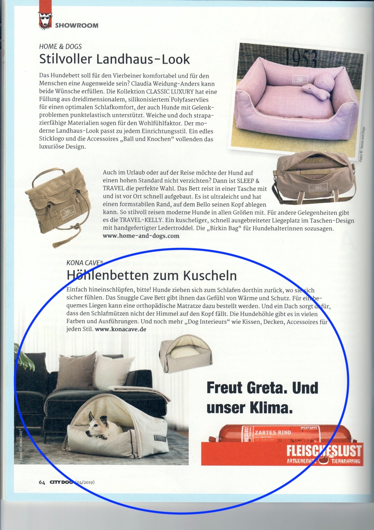 The patented KONA CAVE® Snuggle Cave Dog Bed in cream herringbone is highlighted in CITY DOG.