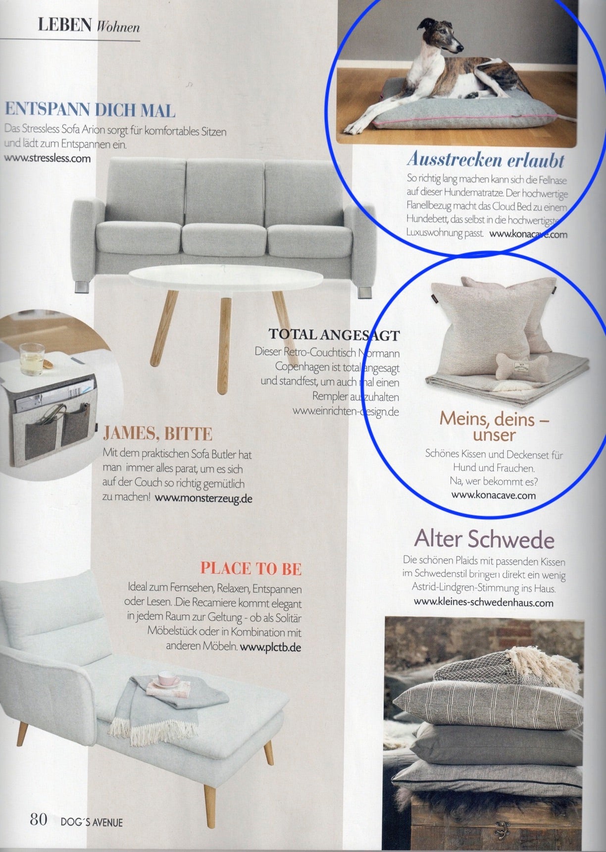 The beautiful KONA CAVE® Cloud Bed in grey flannel with hot pink trim, and our Doggy Décor Set in cream herringbone, are recognized for their home interior design.