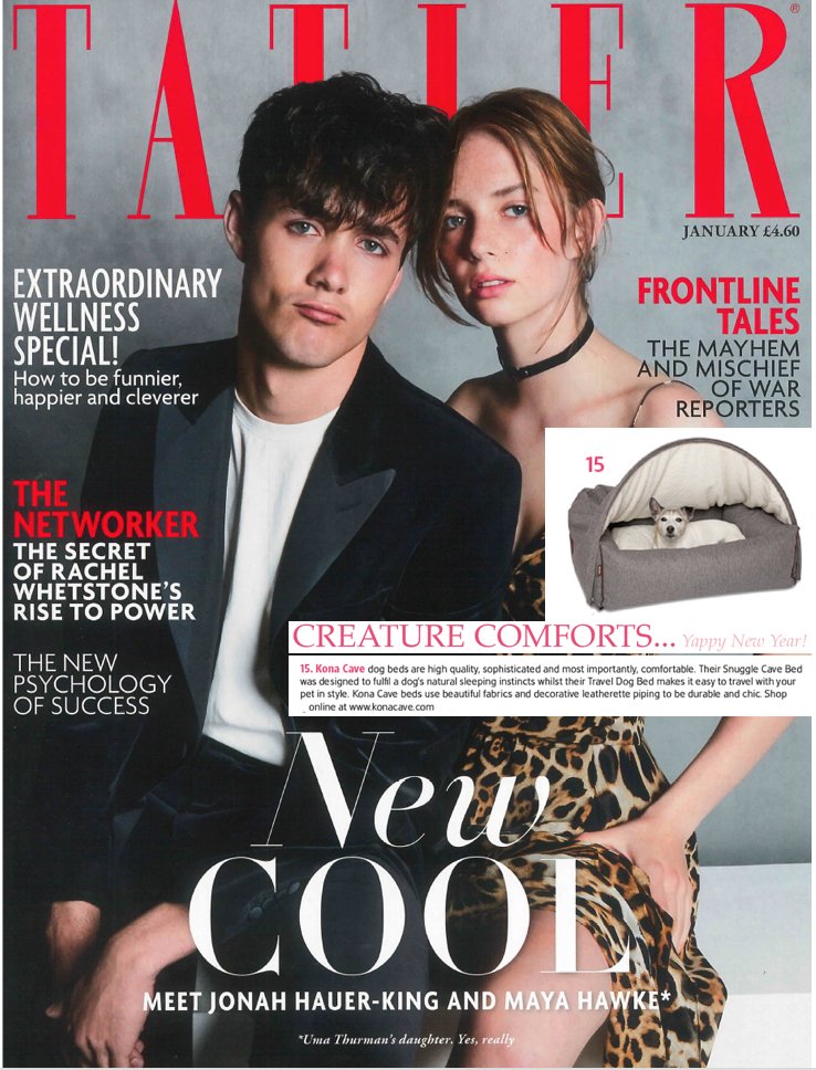KONA CAVE's exclusive Snuggle Cave Dog Bed is recommended by TATLER magazine, January 2018.