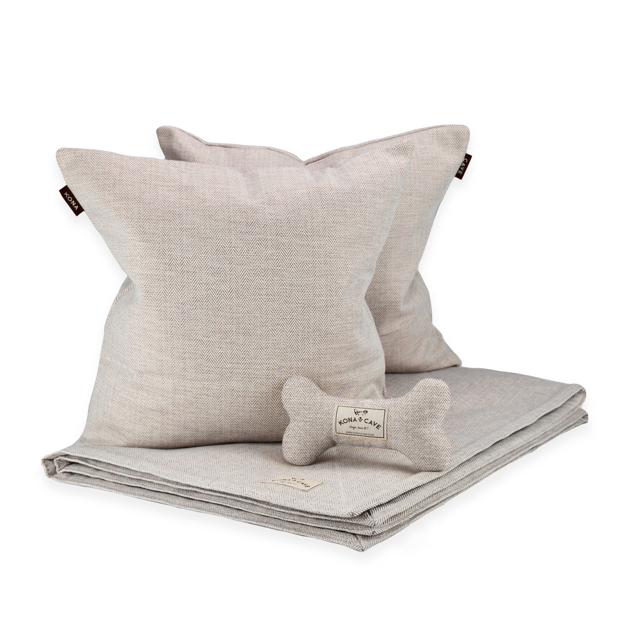 Unser Doggy Décor Set ist das Beste vom Besten: eine kuschelige, mit Gewichten versehene Plüschdecke, die Ihren Hund beruhigt und tröstet, zwei passende dekorative Kissenbezüge und ein entzückender Spielzeugknochen.