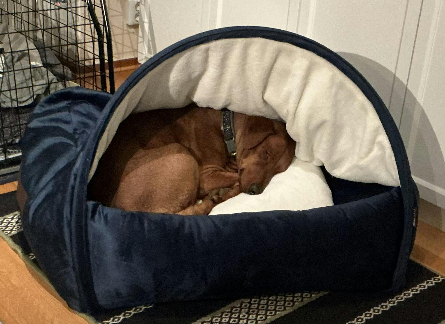 This is our second cave bed. Our dog loves the one we’ve had for a few years in our holiday cottage (Sleepy fox cave), so we decided to get one to have in our apartment (Kona cave). He prefers the fluffy side of the pillow.